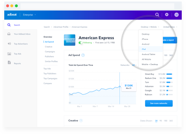 Sort all advertiser data by country and device type. Power up your mobile and international campaigns by accessing advertiser data on 4+ device types and 20+ different countries.
